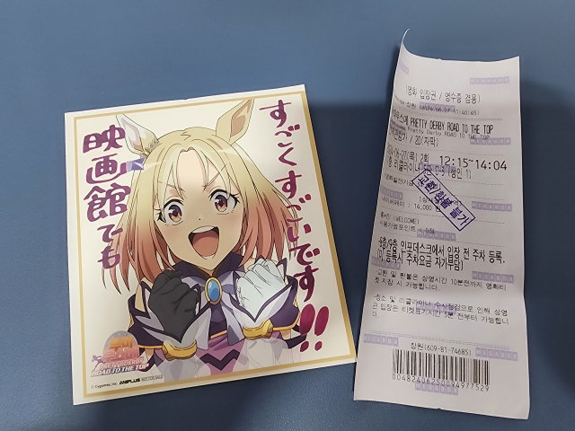 "우마무스메 프리티 더비 ROAD TO THE TOP"(이하 RTTT)의 재편집 상영판을 보고 왔습니다. 유튜브에서 무료 공개되어 있는 애니메이션을 굳이 극장가서 돈 주고 볼 가치가 있을까 싶었는데, 이런 지방에서는 상영 횟수도, 관람객도 많지 않아 자리를 채워주는것도 나름 의미가 있지 않나 싶어서 다녀왔습니다.